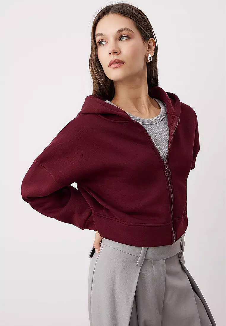Zippered Hooded Casual Cut Crop Thick Fleece Knitted Sweatshirt