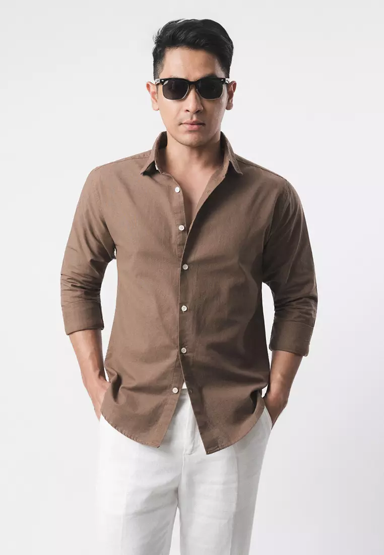 Linen Blend Slim Fit Shirt - Wood Brown LS