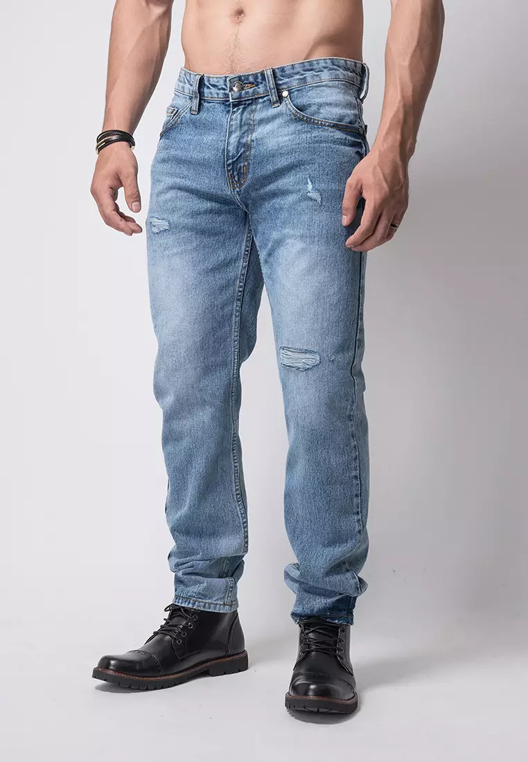 Tapered Fit Jeans Premium Washed Blue Ripped