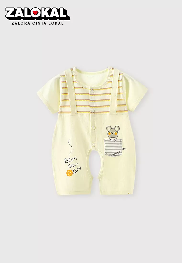 WAKAKIDSJumpsuit Bayi Jumper Pendek Anak Romper Baju Kodok Motif Bear Garis Garis Import 4236 Venrz Kuning139900.0072900.00