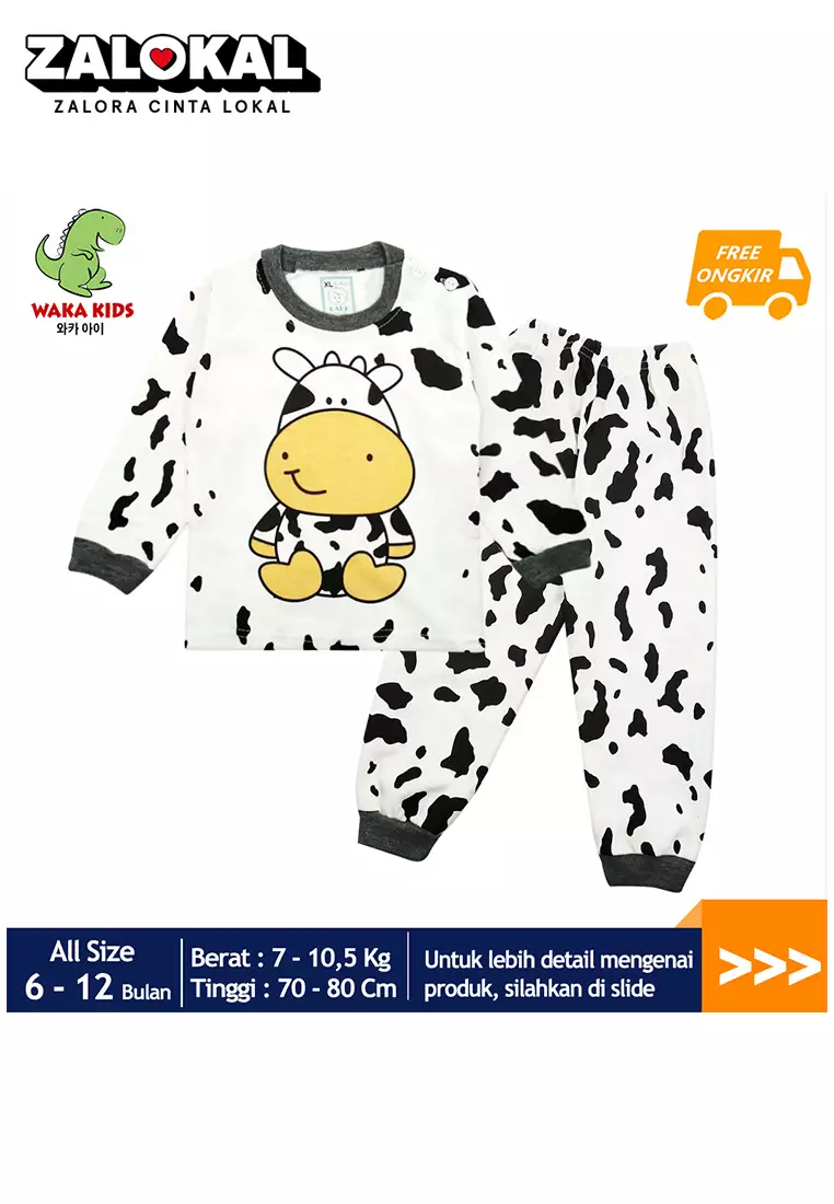 Skabe Piyama Bayi Anak Laki Laki Baju Lengan Panjang Motif Sapi Setelan Celana Kaos All Size Baby Putih Usia 6 Bulan Hingga 12 Bulan 3368