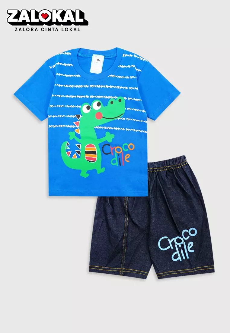 Wakakids Baju Bayi Anak Laki Laki Lengan Pendek Usia 12 Bulan Hingga 18 Bulan Setelan Celana Jeans Motif Crocodile 3320 Turkis