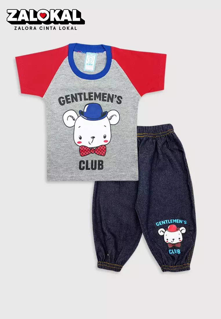 Wakakids Baju Bayi Anak Laki Laki Lengan Pendek Usia 6 Bulan Hingga 12 Bulan Setelan Celana Jeans Jogger Motif Bear 3441 Merah
