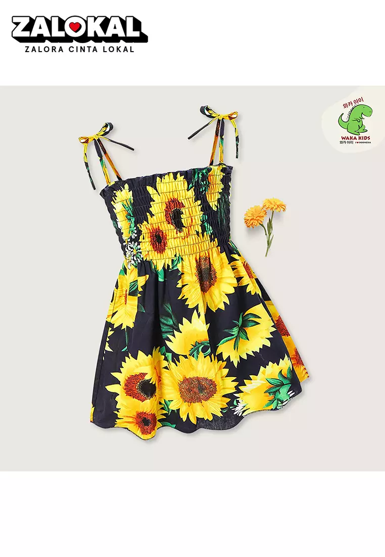 WAKAKIDSWakakids Dress Anak Perempuan Tanpa Lengan Tali Ikat Pundak Katun Dada Full Karet Motif Sunflowers Black 4419 FK Venrz124000.0063900.00
