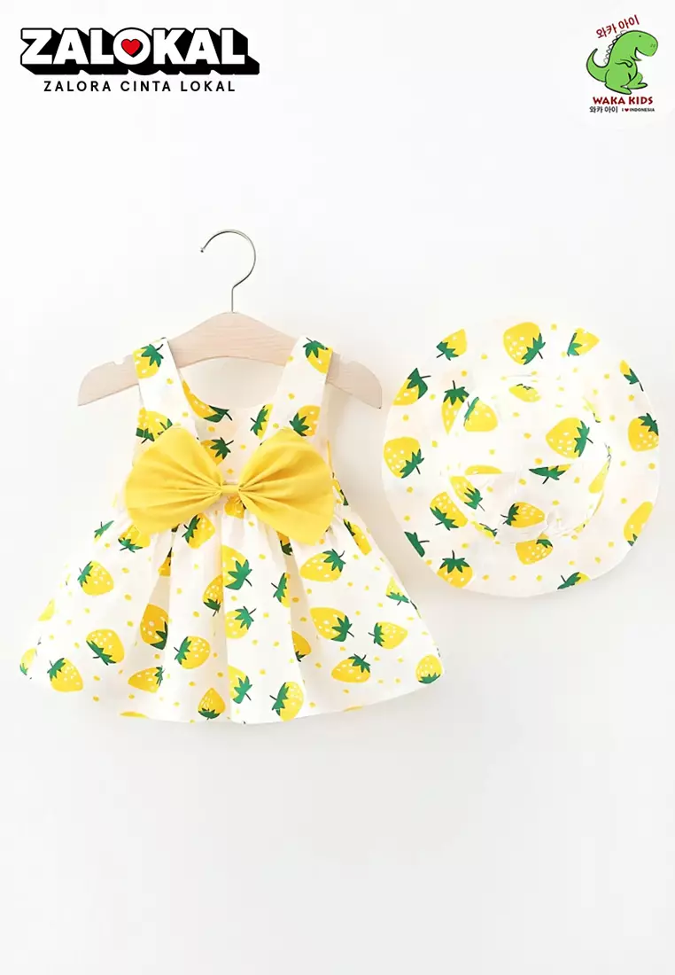 WAKAKIDSWakakids Dress Bayi Anak Perempuan Set dengan Topi Motif Lucu Pita Full Printing Katun 4424 Venrz Berry Kuning214400.00117800.00