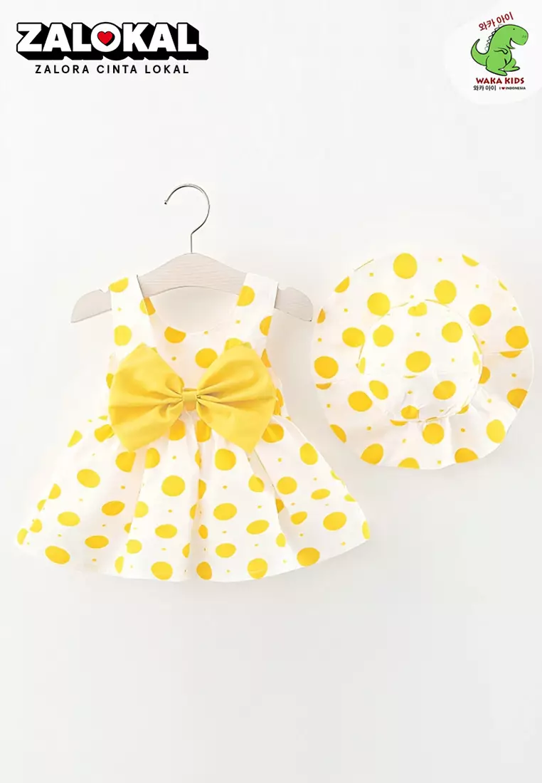 Wakakids Dress Bayi Anak Perempuan Set dengan Topi Motif Lucu Pita Full Printing Katun 4424 Venrz Little Polka Kuning