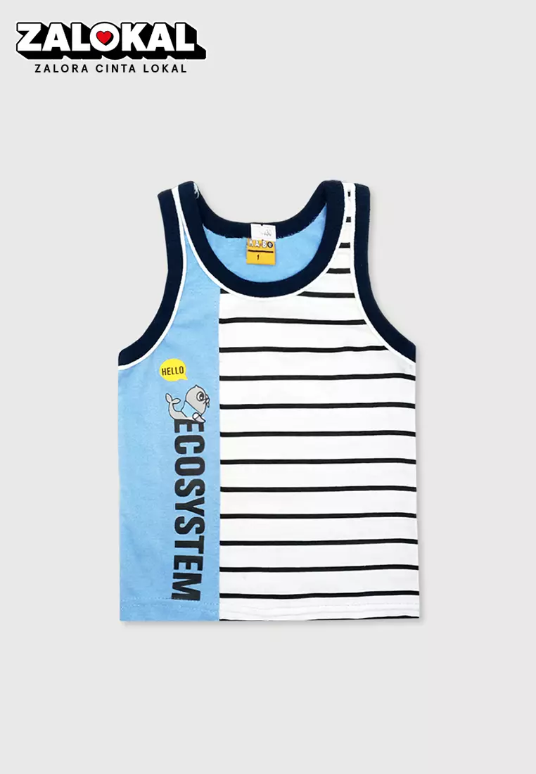 Wakakids Kaos Anak Laki Laki Baju Atasan Singlet Motif Hello Ecosystem Stripe SKATS Biru Muda