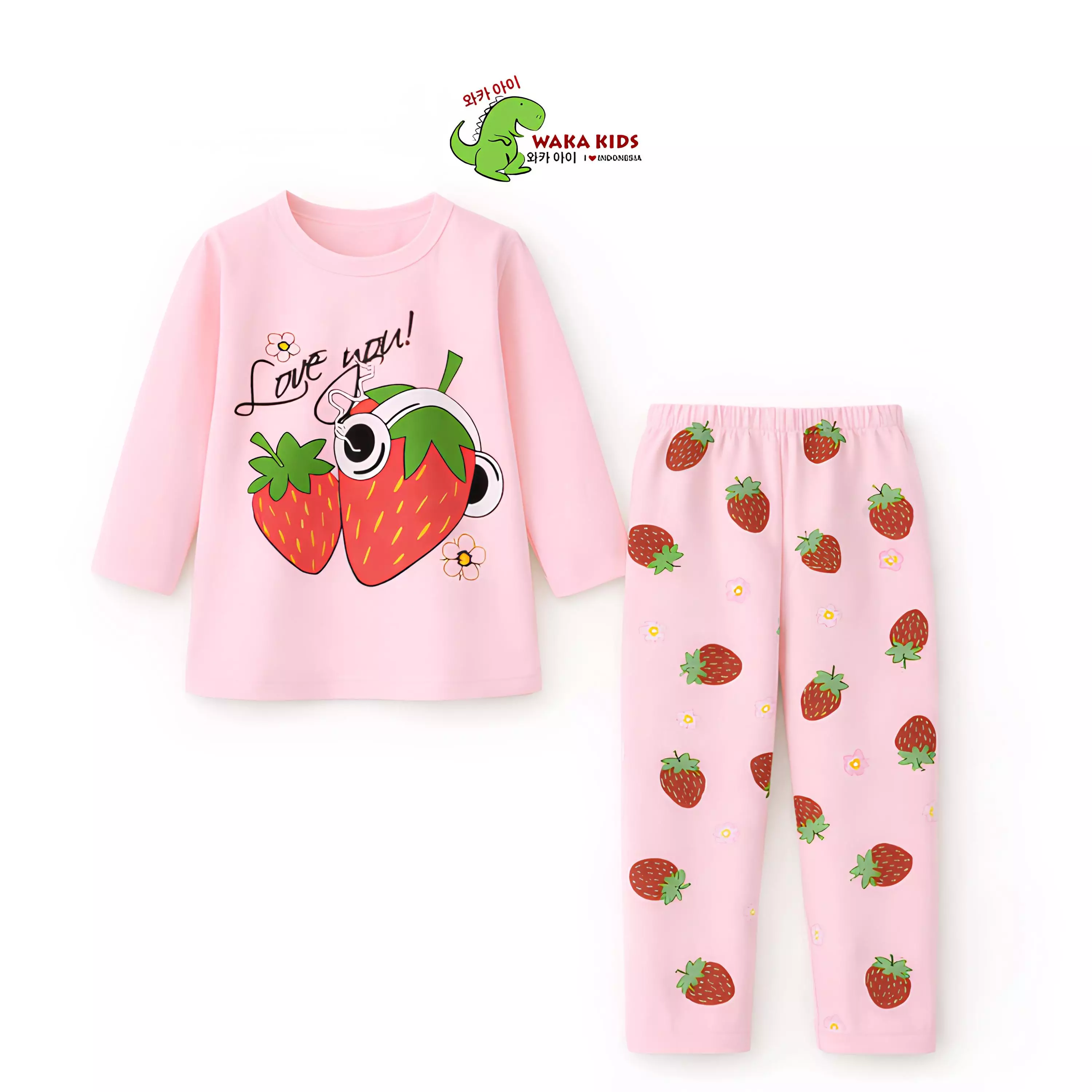 Wakakids Piyama Anak Cotton Setelan Baju Tidur Lengan Panjang Pajama Set Sleepwear Motif Love Strawberry Bahan Adem dan Lembut Venrz 4502
