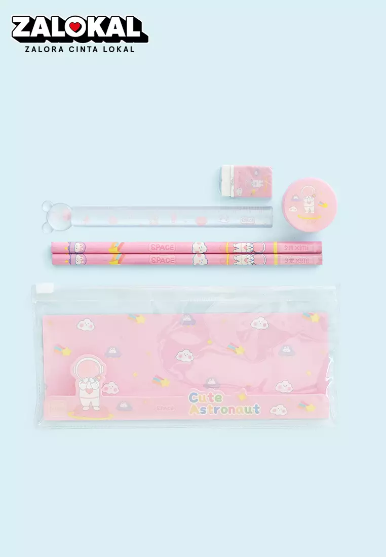 Wakakids Set Alat Tulis Sekolah Anak Mini Stationary 5in1 Motif Astronot Venrc Pink