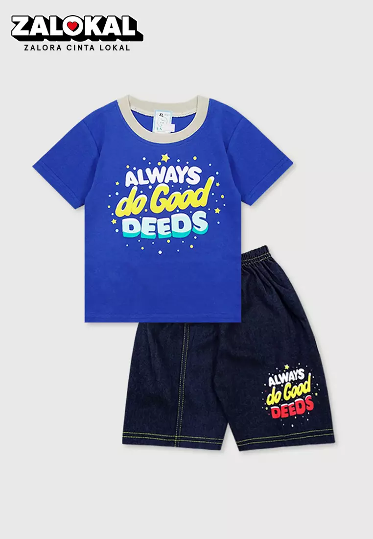 WAKAKIDSWakakids Setelan Bayi Laki Laki Baju Lengan Pendek Anak Usia 12 Bulan Hingga 18 Bulan Set Celana Jeans Motif Always De Good 3039 Biru181900.0065400.00
