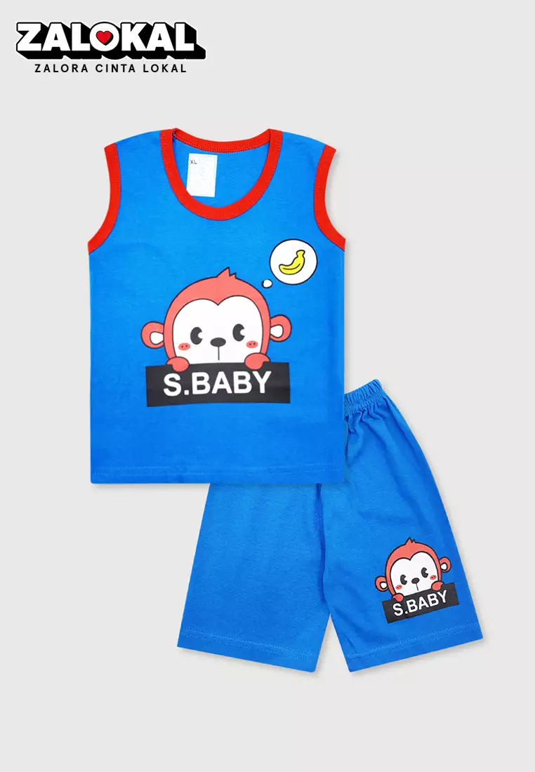Wakakids Setelan Bayi Laki Laki Usia 12 Bulan Hingga 18 Bulan Set Baju Singlet Anak Celana Kaos Motif Baby Monkey 3407 Turkis