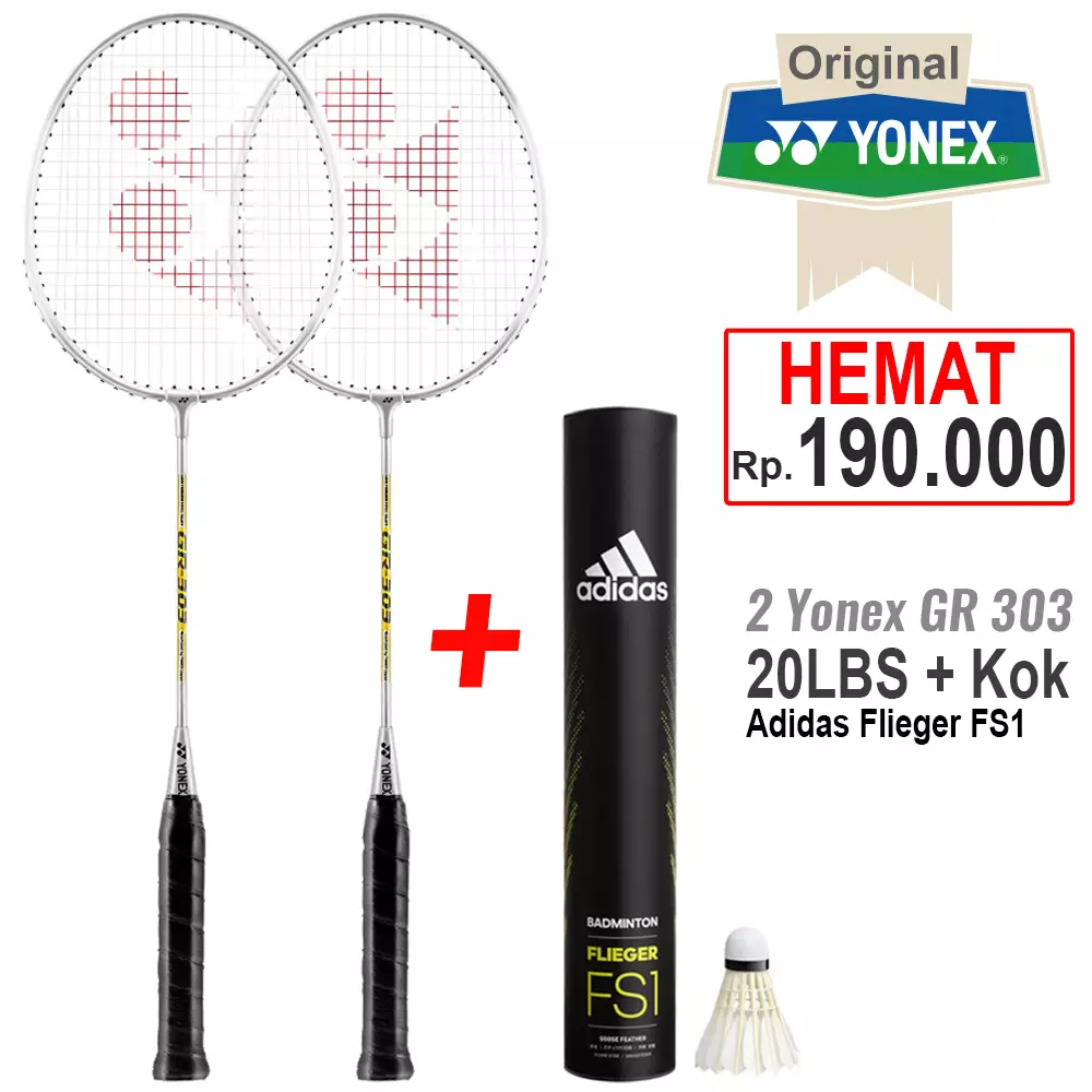 Paket 2 Raket Badminton Yonex Gr 303 Silver dan Shuttlecock Adidas Flieger FS1