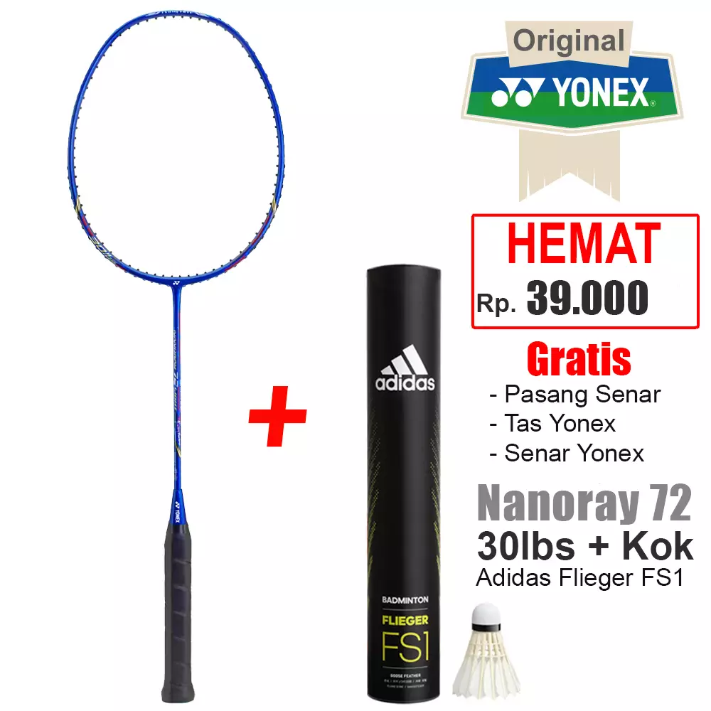 Paket Raket Badminton Yonex Nanoray 72 Light Blue dan 1 Shuttlecock Adidas Flieger FS1