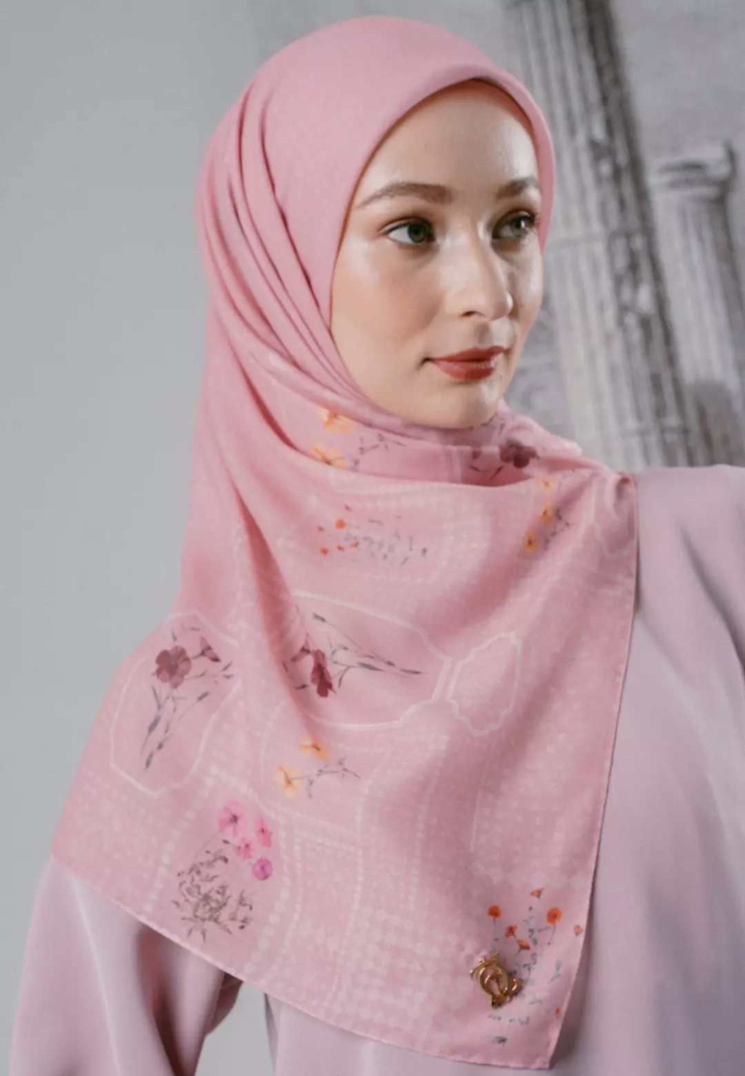 FIORELLA Scarf Pink - Kerudung Hijab Segiempat Motif With BOX - Bahan Nesla - Ukuran 115x115