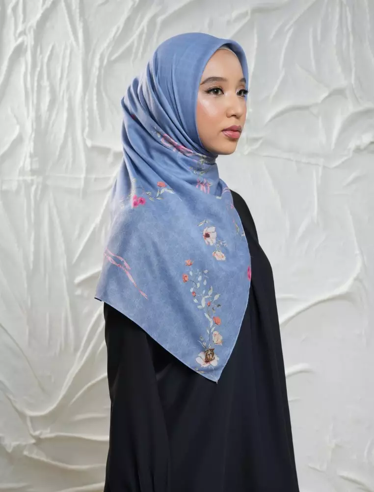 FLEUR Scarf Blue - Kerudung Hijab Segiempat Motif With BOX - Bahan Nesla - Ukuran 115x115