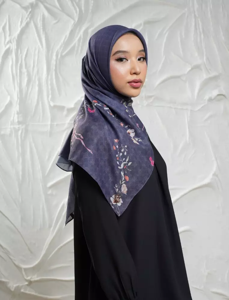 FLEUR Scarf Navy - Kerudung Hijab Segiempat Motif With BOX - Bahan Nesla - Ukuran 115x115