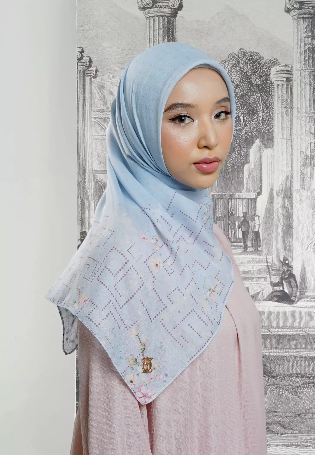 VIOLA Scarf Blue Fog - Kerudung Hijab Segiempat Motif With BOX - Bahan Nesla - Ukuran 115x115